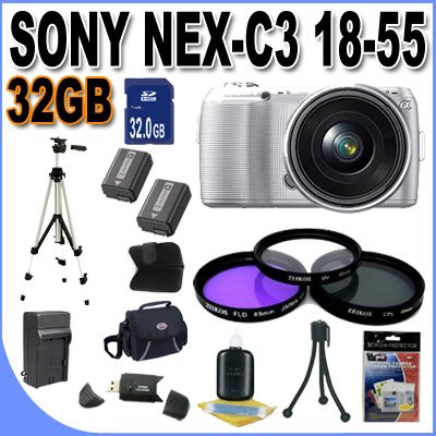 "Sony Alpha NEX-C3 16 MP Compact Interchangeable Lens Digital Camera Kit with 18-55mm Zoom Lens (Silver) + 32GB SDHC Memory + 2 Extended Life Batteries + AC/DC Rapid Charger + 3 Piece Filter Kit + Shock Proof Case w/Strap + LCD Screen Protectors + Full Size Tripod + Mini Tripod + Accessory Saver Kit!" Overview