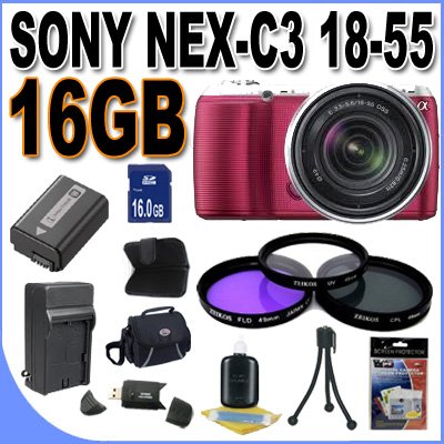 "Sony Alpha NEX-C3 16 MP Compact Interchangeable Lens Digital Camera Kit with 18-55mm Zoom Lens (Pink) + 16GB SDHC Memory + Extended Life Battery + AC/DC Rapid Charger + 3 Piece Filter Kit + Shock Proof Case w/Strap + LCD Screen Protectors + Mini Tripod + Accessory Saver Kit!" Overview