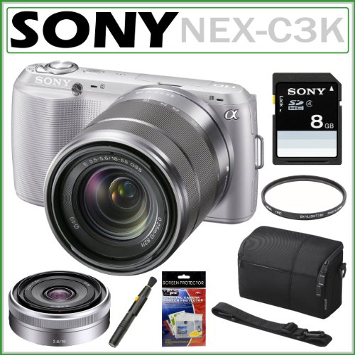 Sony Alpha NEX-C3K 16 MP Compact Interchangeable Lens Digital Camera in Silver with Sony SEL1855 18-55mm Zoom Lens and SEL16F28 16mm Wide-Angle Lens + Sony 8GB SDHC + Hoya Lens Filter + Sony Case + Accessory Bundle for $849.95